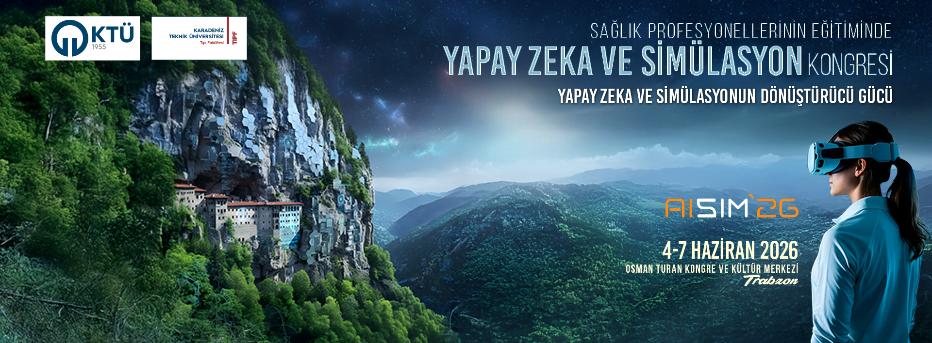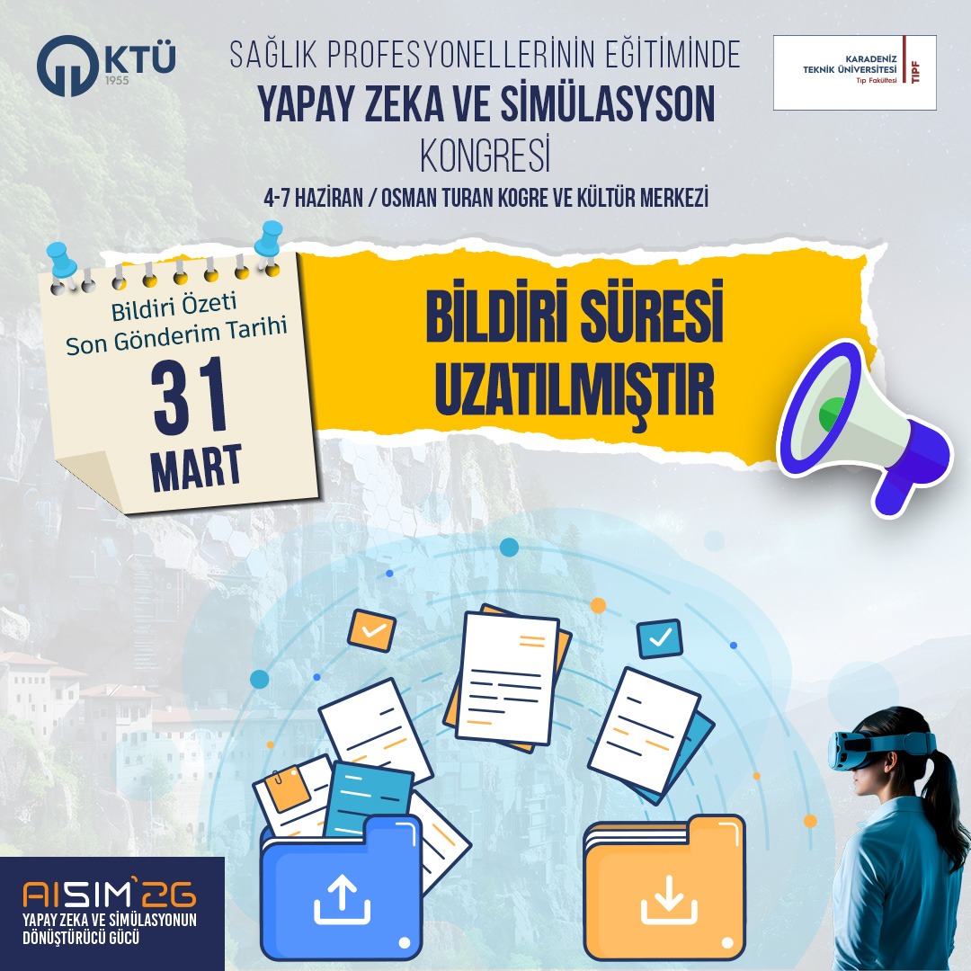 Karadeniz Teknik Üniversitesi ve Tıp Fakültesi ev sahipliğinde, 4-7 Haziran 2026 tarihleri arasında Trabzon'da düzenlenecek olan Sağlık Profesyonellerinin Eğitiminde Yapay Zeka ve Simülasyon Kongresi'ne sizleri davet etmekten büyük mutluluk duyuyoruz. Kongremizin mottosu "Sağlık Profesyonellerinin Eğitiminde Yapay Zeka ve Simülasyonun Dönüştürücü Gücü" olarak belirlenmiştir.